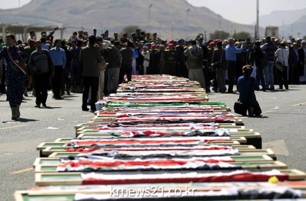 예멘 정부군과 시아파 후티 반군 충돌로 사망한 전투원들의 장례식.
