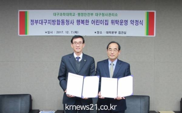 대구과학대학교는 행정안전부 대구청사관리소와 7일 대학본부 접견실에서 '정부대구지방합동청사 행복한 어린이집' 위탁운영을 위한 약정을 체결했다고 밝혔다.