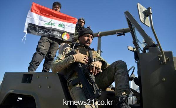 하이데르 알아바디 이라크 총리가 IS를 완전히 격퇴했다고 선언한 후 이라크-시리아 국경에 있는 군인들이 깃발을 펼치며 승리를 기념하고 있다.