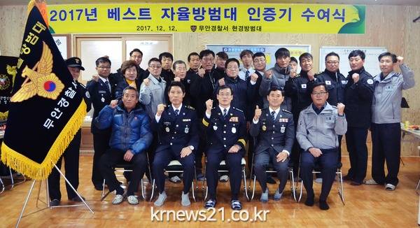 무안경찰서(서장 정경채)는 지난 12. 12.(화) 무안군 현경자율방범대 사무실에서 공동체치안 활성화의 일환으로 자율방범대 사기진작을 위해‘17년도 베스트 자율방범대로 현경 자율방범대를 선정하고 인증기 수여식을 가졌다.