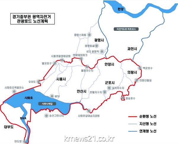 한편, 경기중부권 광역자전거 관광로드는 7개 지방자치단체가 보유하고 있는 관광자원과 자전거도로를 연계해 순환형 도로를 조성하고 한강변 자전거도로와 연계하는 자전거관광 네트워크 구축사업이다.