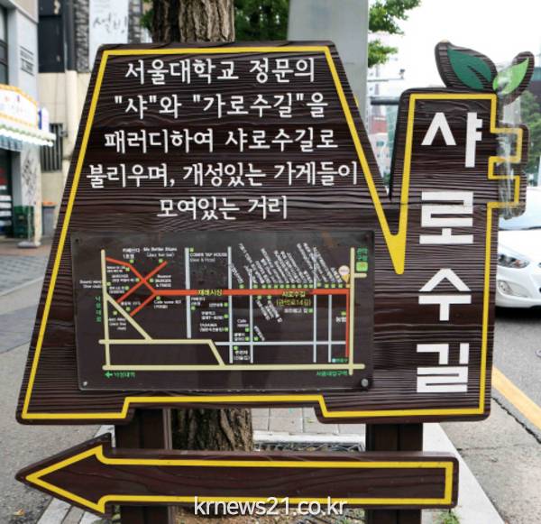 샤로수길은 관악구 서울대 정문 모양을 본뜬 ‘샤’와 강남구 신사동에 있는 ‘가로수길’을 합친 신조어다. 관악구청 건너편에서 낙성대역 쪽으로 이어지는 이 길은 다양한 개성있는 맛집과 상점들이 즐비해 서울 골목상권 중에서도 핫플레이스로 꼽히는 곳이다.