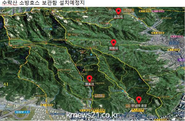구는 대형산불 발생시 신속한 진압을 위해 약 1억6000만원을 들여 수락산 4곳, 불암산 4곳에 소방호스 보관함을 설치, 소방 호스(1.5km분량)를 보관하기로 했다.