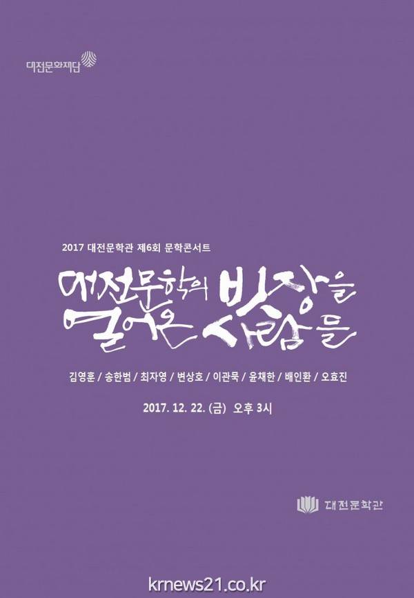 대전문화재단(대표이사 이춘아)이 운영하는 대전문학관(관장 박진용)은 오는 22일 대전문학관 기획전시실에서 2017 대전문인 사진 · 영상 아카이빙 작가 초청 문학콘서트 ‘대전문학의 빗장을 열어온 사람들’을 개최한다.