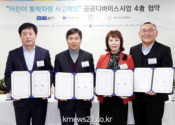 용인시는 19일 시청 시민사랑방에서 시스템을 개발한 아바드(주)와 재단법인 행복한 에코 폰, 용인시어린이집연합회 등 4개 기관이 ‘어린이통학차량 사고예방 공공디바이스사업’업무협약을 맺었다고 밝혔다.