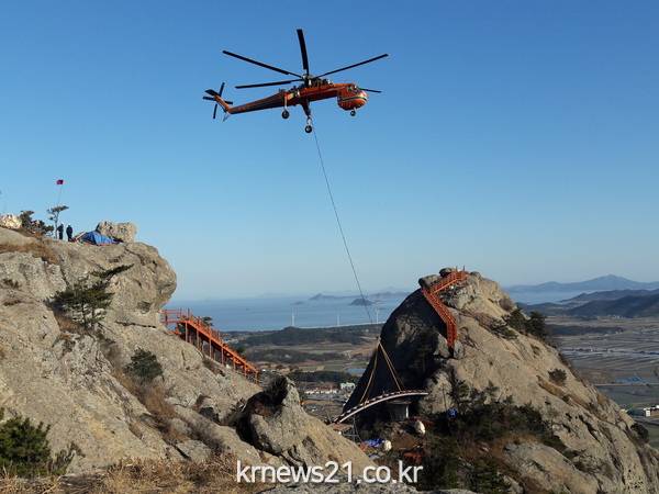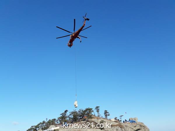 관계자에 따르면, 이번 산림청 헬기 지원은 산림항공본부 함양관리소(소장 강경우)의 대형헬기 KA-32와 진천관리소(소장 유창용)의 초대형헬기 S-64가 투입되어 지난 10월23일부터 12월 20일까지 6회에 걸쳐 선왕산 투구봉에 목재, 모래, 시멘트, H빔, 부수자재 등 약 100톤의 각종 자재를 안전하게 운반 완료하였다고 밝혔다.