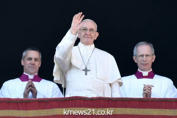 교황 프란치스코는 바티칸에있는 성 베드로 대성당의 발코니에서 경례를 받는다.