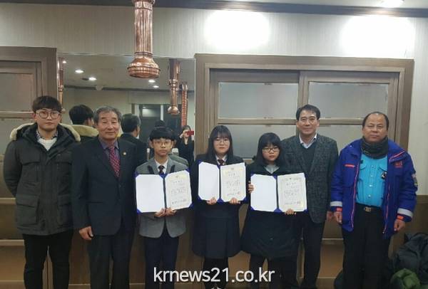 영동경찰서 중앙지구대 중앙생활안전협의회 회원들은 영동읍 소재 한 식당에서 관내 초·중·고등학교 모범학생 3명을 추천받아 장학금 각 20만원씩을 전달하는 이색적이고 뜻깊은 송년회 행사를 가졌다.