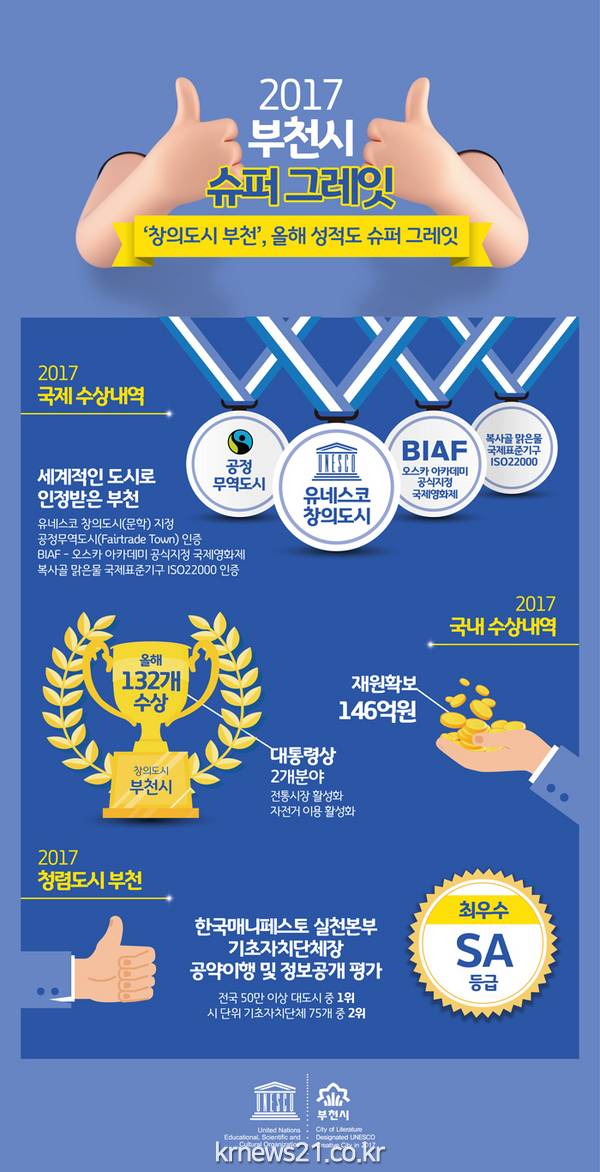 부천국제애니메이션페스티벌은 국내 영화제 중 처음으로 오스카 아카데미 공식지정 국제영화제가 됐고, 부천시 수돗물인 복사골 맑은물이 기초자치단체 중 최초로 국제표준기구의 ISO22000 인증을 획득했다. 시는 올해 WHO 서태평양 건강도시연맹 가입 인증을 받기도 했다.