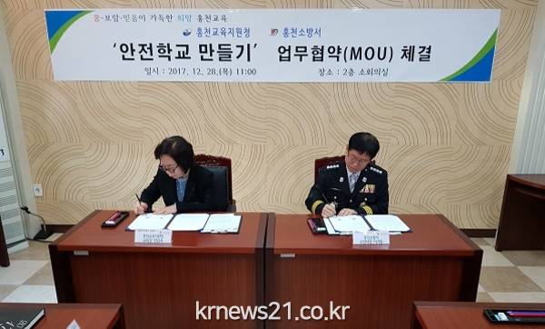 홍천소방서(서장 이기중)는 지난 21일 오전 11시 홍천교육지원청 회의실에서 ‘안전학교 만들기 프로젝트’ MOU를 맺었다.