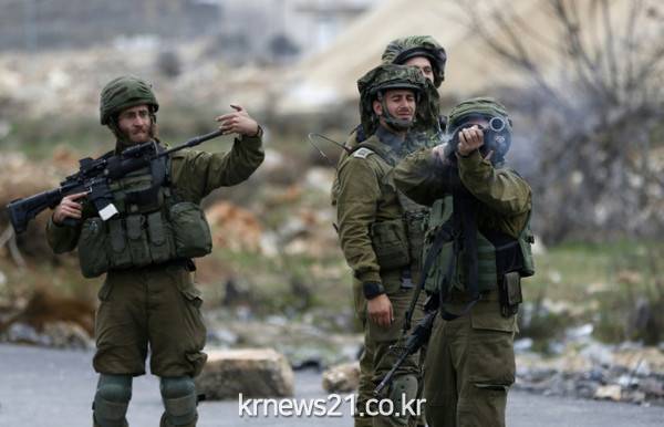 이스라엘 군인들이 베투니아 마을의 교도소 근처에서 최루탄을 쏘고있다.