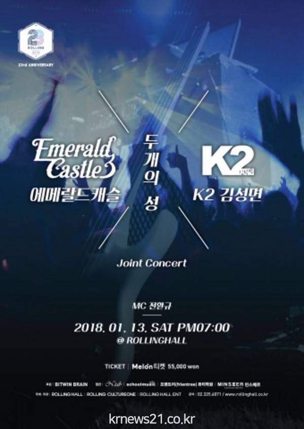 최근 17년만의 재결성으로 화제를 모았던 베테랑 락 밴드 ‘에메랄드 캐슬’과 오래 동안 팬들의 사랑을 받아온 ‘사랑과 우정사이’, ‘소유하지 않는 사랑’의 락 보컬 ‘K2 김성면’이 조인트 콘서트로 무대에 오른다.