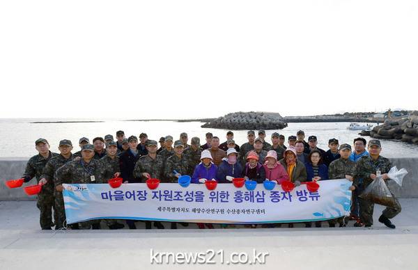 제주기지전대 민군협력실에 따르면 이날 해삼 종자 방류는 제주해양수산연구원의 무상 지원으로 진행됐다.