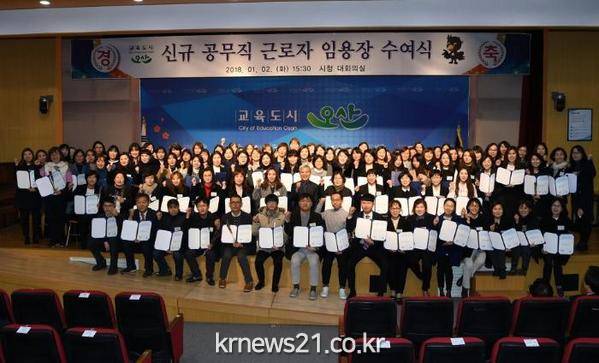 오산시(시장 곽상욱)는 지난 2일 신규 공무직 근로자 104명에게 임용장을 수여하고 기본 직무교육을 실시하였다고 밝혔다.