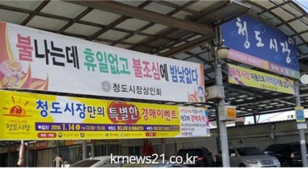 한편 청도시장은 지난해 9월 골목형시장육성사업에 선정되어 ‘새벽을 여는 청도시장’을 테마로 △특화환경조성 △디자인특화지원 △문화·ICT특화지원 △상품특화지원 △교육 및 이벤트 행사, 홍보의 5개 분야 9개 사업을 진행하고 있으며, 올해 2월 사업이 완료될 예정이다.