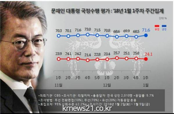 여론조사 전문기관 리얼미터가 CBS 의뢰로 2~5일 조사해 8일 발표한 여론에 따르면 문재인 대통령의 취임 35주차 국정수행 지지도(긍정평가)는 지난주 대비 3.1%p 오른 71.6%(매우 잘함 46.2%, 잘하는 편 25.4%)를 기록했다.