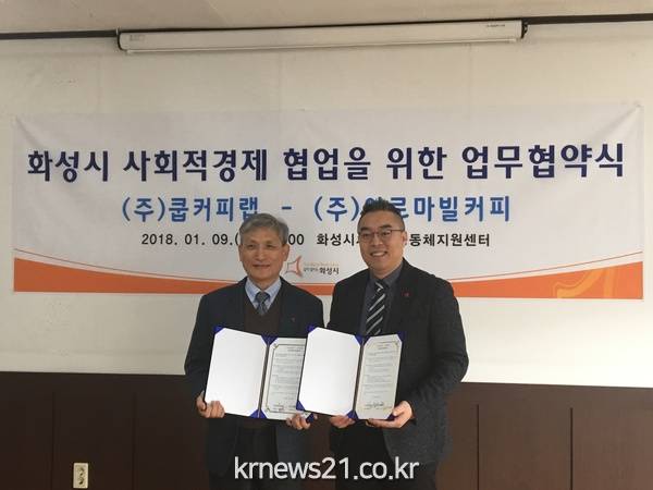 화성시 대표 사회적기업인 ㈜쿱커피랩은 예비 사회적 기업 ㈜아로마빌커피와 9일 화성시 사회적공동체지원센터에서 업무협약을 체결하고 작업장 공유 및 마케팅 등 공동브랜드 사업을 추진키로 했다.