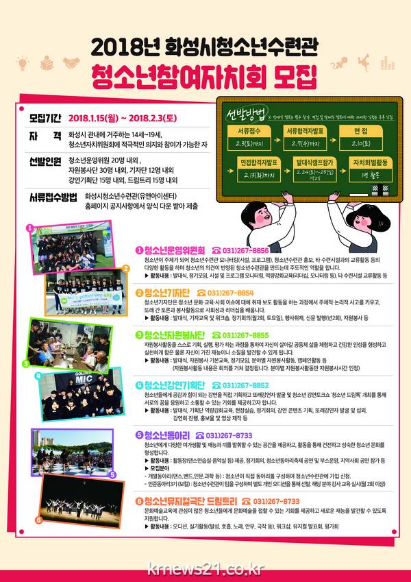 화성시청소년수련관에서는 청소년들의 자발적인 참여활동을 통해 지역사회 발전에 기여하기 위해 ‘2018년 청소년 참여 자치회’를 모집한다고 밝혔다.