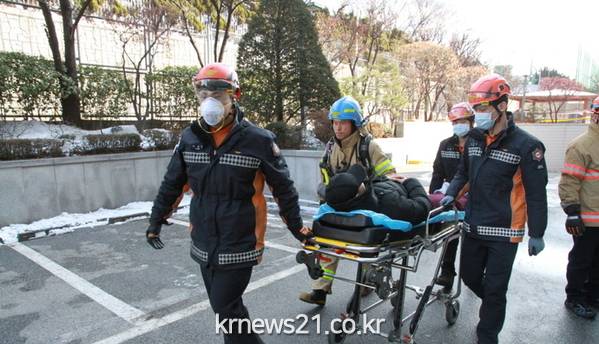 이날 훈련은 가상의 적 포격에 의해 SK수유국사 건물은 화마로 덮힌 상황을 가정해 진행됐다.