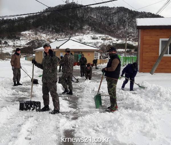 영광군 낙월면 안마도에 10여년 만에 찾아온 폭설과 강풍으로 고립된 섬 주민들을 위해 해군부대가 제설작업에 나섰다.