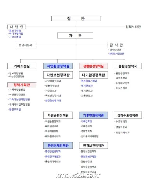 환경부는 이와 함께 기획조정실장 아래 정책기획관을 신설했고, 그 아래 '지속가능전략담당관'과 '환경교육팀'을 두기로 했다.