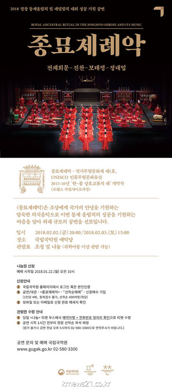 2018 평창 동계올림픽의 성공적인 개최를 위해 유네스코가 한국전통문화 중 2001년 최초로 인류무형문화유산으로 선정한 작품이자 국가무형문화제 제1호인 ‘종묘제례악’이 역대 최대 규모로 서울 서초구 국립국악원 예악당 무대에 오른다.