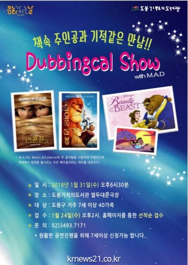 1월 31일 수요일, 도봉기적의도서관에서 '더빙컬 쇼! 책 속 주인공과 기적 같은 만남'이라는 주제로 펼쳐지는 이번 프로그램은 성우공연팀 M.A.D(Music, Art, Dance)의 공연, 해외 유명인사 및 애니메이션 캐릭터의 새해 인사말, 입체낭독공연에 이어 라이온킹, 알라딘, 인어공주, 라푼젤 등 명작 애니메이션의 아름다운 OST를 대사 더빙과 함께 공연하는 순으로 진행된다.