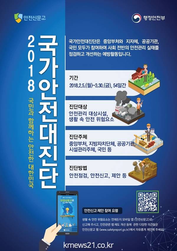 국민과 함께하는 ‘2018년 국가안전대진단’이 내달 5일부터 3월 30일까지 전국에서 일제히 실시된다.