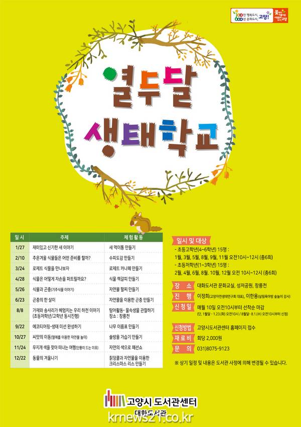 고양시(시장 최성) 대화도서관은 2018년 한 해 동안 초등학생을 대상으로 ‘열두달 생태학교’를 운영한다.