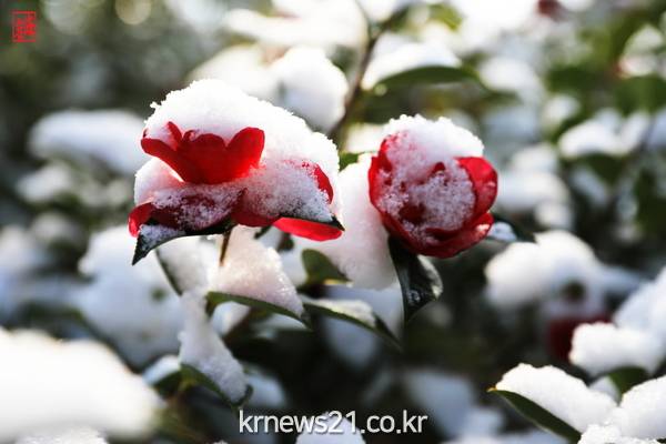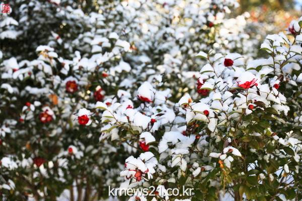 신안군 압해읍 송공산 분재공원에 애기동백꽃이 설경과 함께 만개하여 관람객들의 발길을 유혹하고 있다.