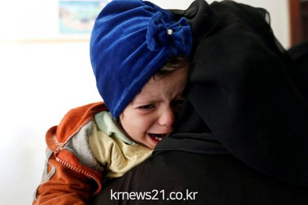 예멘 내전으로 40만여 명의 어린이들이 영양실조로 고통받는 가운데 수도 사나(Sanaa) 외곽 바니 하와트(Bani Hawat) 지역에서 한 아이가 의사 검진을 기다리고 있다.