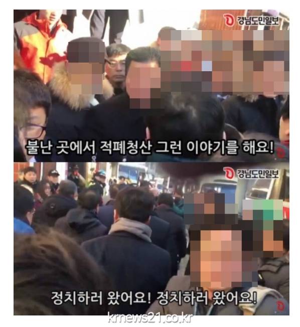 이에 현장에 있던 한 시민은 “아니 의원님, 지금 불난 집에 와서 무슨 그런 말을 하느냐. 불난 곳에서 적폐청산을 얘기 하냐”며 항의했다. 다른 시민들은 김 원내대표를 향해 “정치하러 왔어요. 정치하러 왔어요”라며 소리치기도 했다.