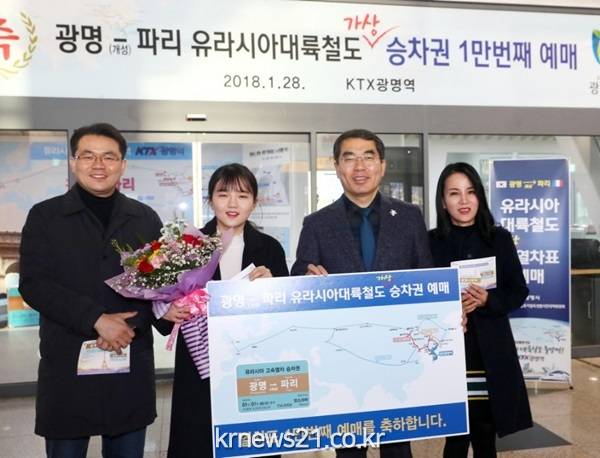 광명시는 28일 오전 9시 KTX광명역 내 광명시 홍보관에서 양기대 시장과 예매자, 유라시아대륙철도 추진본부 관계자 등이 참석한 가운데 광명-파리행 열차표 예매 1만매 돌파기념 행사를 열었다.