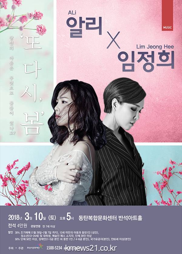 동탄 복합 문화센터 반석아트홀에서 3월 공연을 앞두고 있는 <</span>알리X임정희 콘서트‘또 다시, 봄’>의 티켓 판매가 29일 월요일부터 시작된다.
