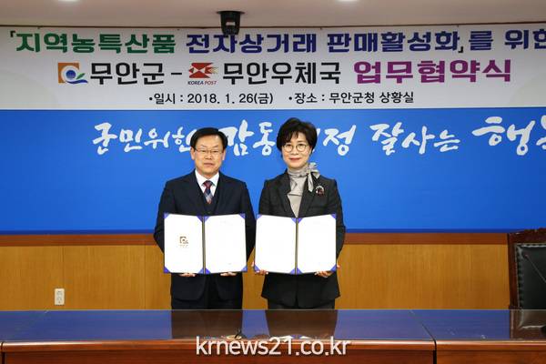 무안군(군수권한대행 장영식)과 무안우체국은 지난 26일 무안 우수 농특산물 직거래 활성화와 다양한 상품 개발·판매를 위한 업무협약(MOU)을 체결했다.