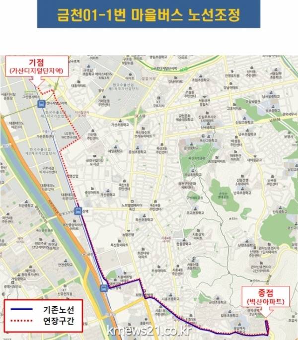 마을버스 금천01번은 독산역~벽산아파트 간 운행되는 노선으로 1일 평균 1만9,000여명의 많은 주민들이 이용하고 있지만, 1·7호선 환승역인 가산디지털단지역까지 운행되지 않아 주민들이 불편을 겪어왔다.