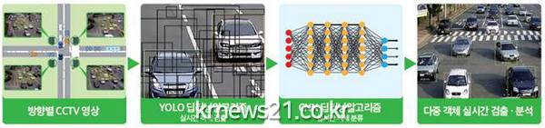 스마트교차로는 지난해 12월 전국 최초로 시내 주요교차로 18개소에 구축한 '딥 러닝(인공신경망 기계학습기술)' 기반의 교통관리시스템이다. 이 시스템은 교차로의 접근로별 교통 조건(총통행량, 회전통행량, 차종 등)을 수집하고 실시간으로 혼잡 수준을 분석한다.
