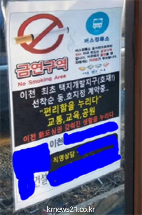 현장확인 결과, 버스정류장에는 무단 게시된 분양업체 광고물에는 금연 계도문구와 이천시 로고가 사용되고 있었다.