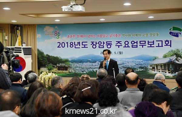 장암동은 이날 2018년 주요업무보고회에서 능동적 행정 구현, 주민자치 기능 강화, 청결한 마을 조성을 주요 업무계획으로 보고했다.