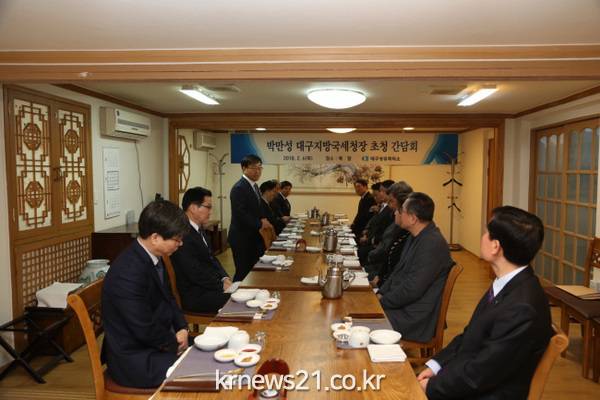 박 대구청장은 6일 대구상공회의소 초청으로 회장단과 간담회를 갖고 올해 국세행정 운영방안 공유와 일자리 안정자금 지원사업 홍보를 위한 소통의 시간을 가졌다.