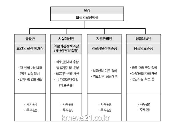 TF는 복지부 보건의료정책관을 단장으로 총괄반, 시설개선반, 자원관리반, 응급대책반 등 4개 반으로 구성된다.