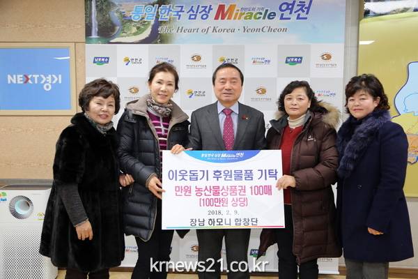 지난 9일 연천군 장남면 하모니 합창단(단장 최인순)은 제4회 장모니 합창단 정기 연주회시 마련한 불우이웃 돕기 성금으로 만원권 농산물 상품권 100매를 구입하여 설맞이 어려운 이웃을 위해 써달라며 연천군에 기탁했다.