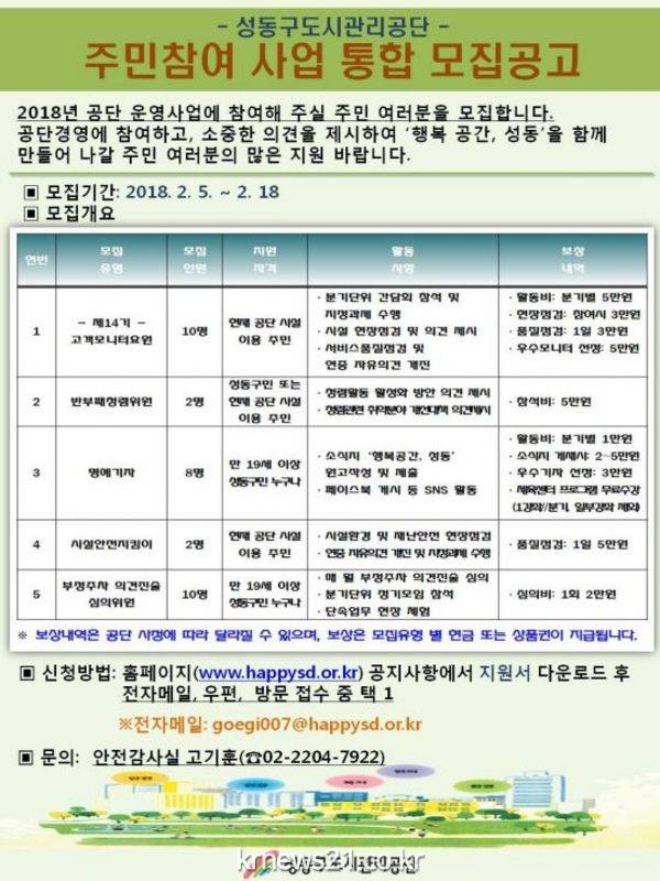 성동구도시관리공단(이사장 김종수, www.happysd.or.kr)이 지난 5일부터 18일까지 2018년 주민참여 사업 통합 모집을 시행한다.