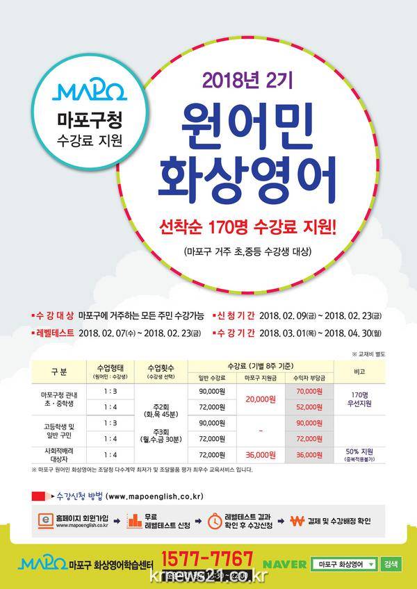 마포구(구청장 박홍섭)는 오는 2월 23일(금)까지 온라인 사이트를 통해 해외 현지 원어민 강사에게 영어회화를 배우는 ‘2018년 원어민 화상영어’ 2기 수강생을 모집한다고 밝혔다.