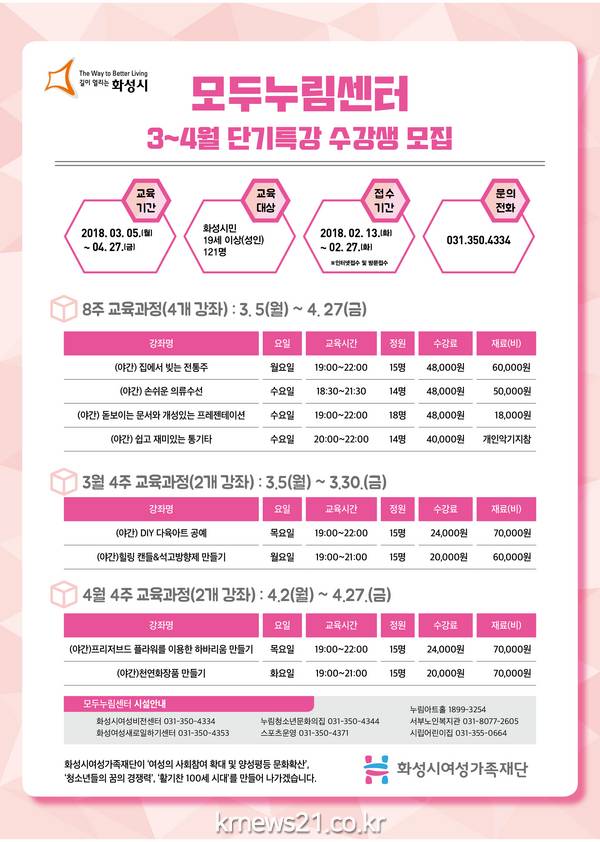 자세한 사항은 화성시여성가족재단 모두누림센터(031-350-4334)로 문의하면 된다.
