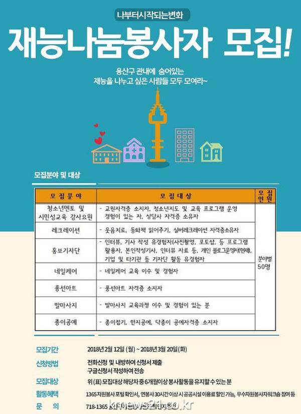 용산구(구청장 성장현) 자원봉사센터가 지역 내 자원봉사 확산을 위해 내달 20일까지 재능 나눔 봉사자 350명을 모집한다.