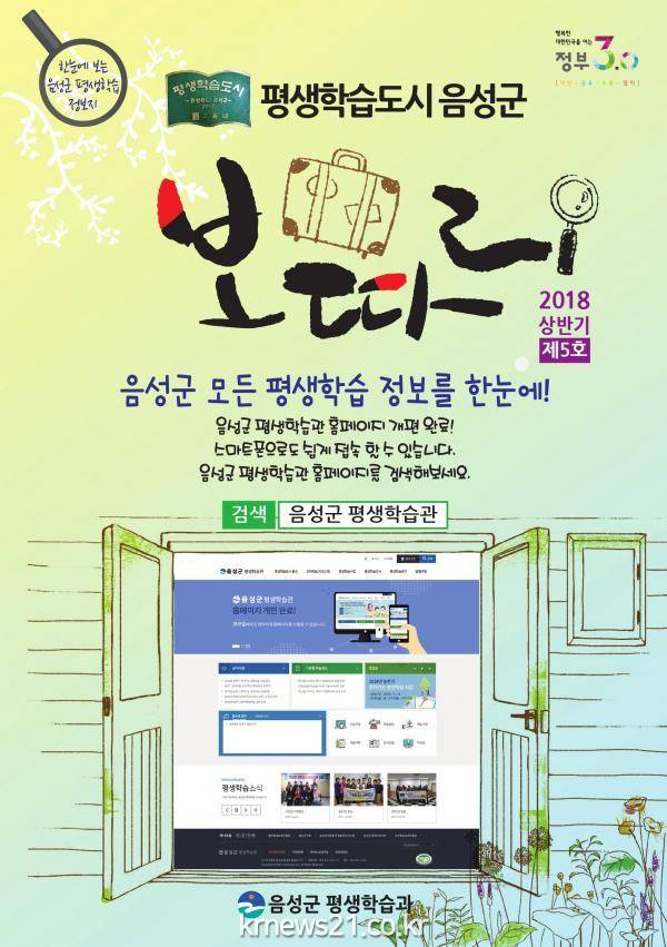 이번 정보지에는 2018년 상반기 찾아가는 평생학습, 뉴라이프 아카데미, 음성시민대학 등 2018년 상반기 평생학습 사업과 음성도서관, 정보화교육, 여성회관, 노인복지관 등 지역내 기관의 프로그램 정보가 수록됐다.