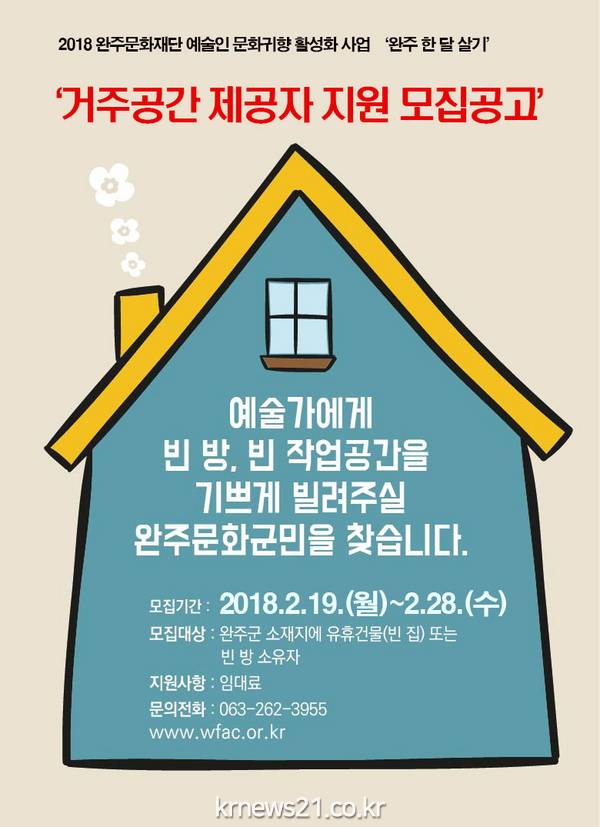 (재)완주문화재단(이사장 박성일)은 오는 2월 28일(수)일까지 예술인 문화귀향 활성화 지원사업으로 예술인 ‘완주 한 달 살기’거주공간 제공자 모집을 진행한다.