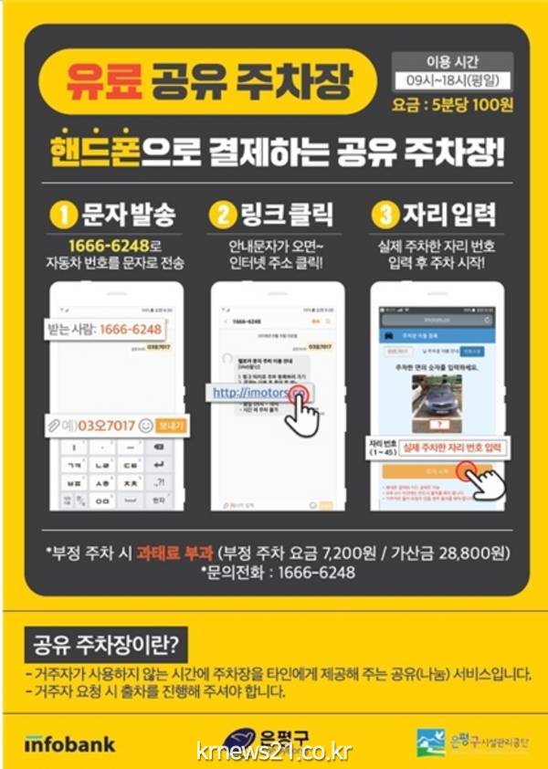 은평구(구청장 김우영)는 3월부터 불광2동 공영주차장 41면을 시범지역으로 선정, 전국 최초 양방향 무인문자 주차시스템을 도입해 거주자 우선주차장 공유사업을 운영한다.