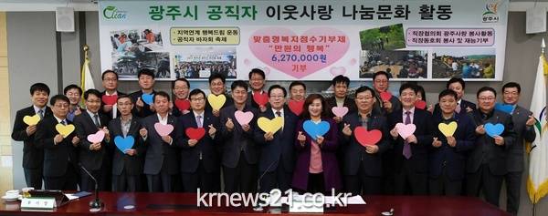 광주시와(시장 조억동) 광주시청직장협의회(협의회장 김순미)는 맞춤형 복지점수 기부제인 ‘만원의 행복’으로 지역의 어려운 이웃들에게 따뜻한 온정을 전한다.